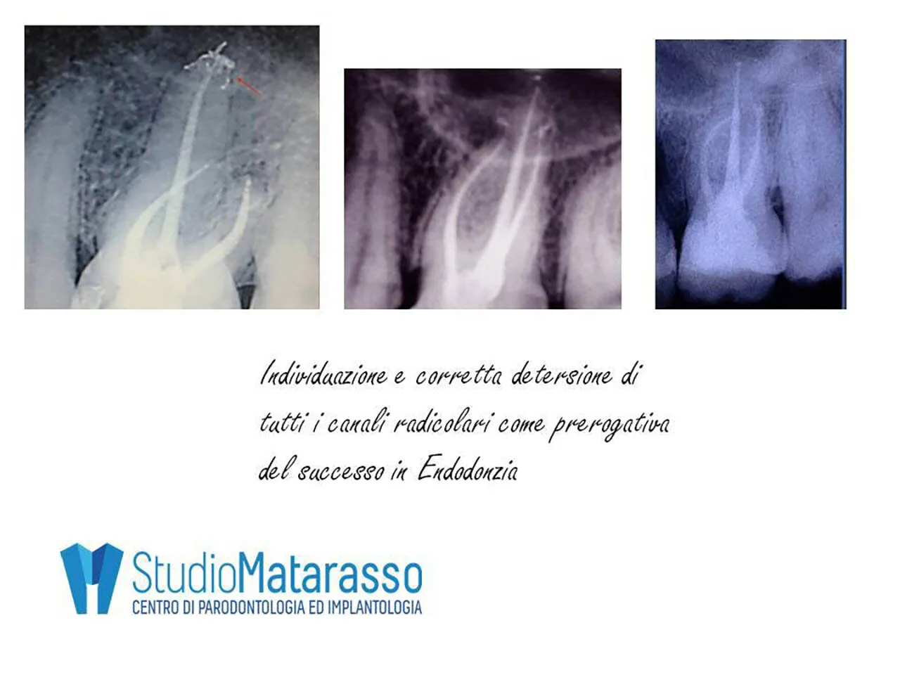 Con il termine endodonzia si intende quella branca dell'odontoiatria che si occupa della terapia dell'endodonto, ovvero lo spazio all'interno dell'elemento dentario che contiene la polpa dentaria , costituita da componente cellulare, vasi e nervi. Mediante la terapia endodontica, la camera pulpare ed i canali radicolari vengono svuotati, sagomati, detersi, disinfettati ed infine otturati.La terapia endodontica permette di trattare e conservare elementi dentari gravemente cariati, evitando la perdita degli stessi.E' una terapia necessaria in presenza di una pulpite, un granuola ( patologia infiammatoria cronica che circonda l'apice della radice e che si verifica con l'avanzare della carie e della pulpite.E' asintomatica e rivelata da un esame radiologico) o quando il dente per motivi protesici deve essere "rimpicciolito" (monconizzato).